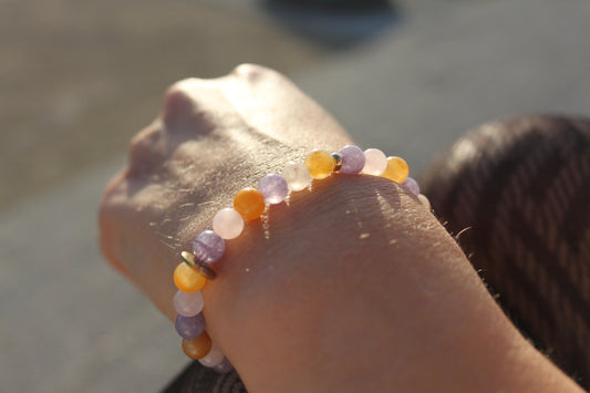 Bracelet en pierre du soleil, calcédoine mauve et aventurine jaune